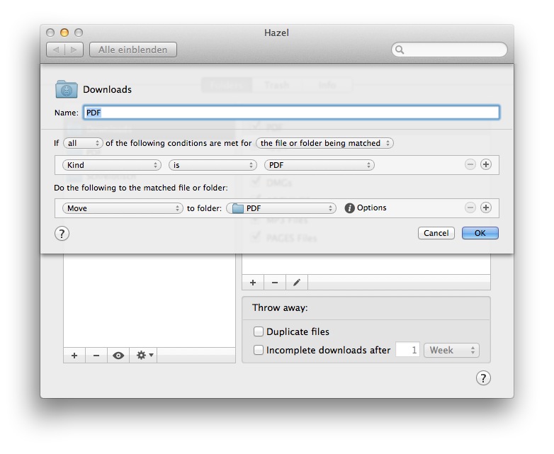 Vor kurzem fand ich das Tool Hazel. Mit Hazel kann man Regeln zur Überwachung von Ordnern erstellen. Zum Beispiel, dass alle .app Dateien direkt in den Downloads/APP Ordner verschoben werden.