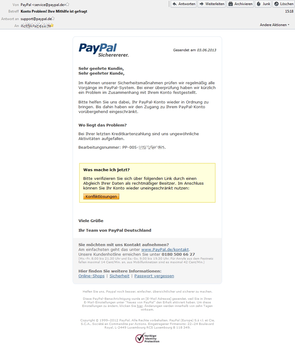 Ich habe dann mal mit dem Paypal Support telefoniert und nachgefragt: In der Tat. Eine Phishing E-Mail. Der passende Kontext zu meinem Vorfall bei E-Bay ist natürlich reiner Zufall gewesen. Ich sollte die E-Mail inklusive aller Header an spoof@paypal.com weiterleiten. Man kümmert sich dann um alles weitere.