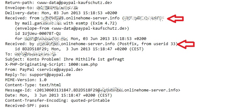 Auffallend ist, dass die E-Mail anscheinend von einem onlinehome-server.info Server verschickt wurde.Das ist in der Regel natürlich nicht der Fall. Die Mails haben DNS Einträge, die direkt auf Paypal zeigen.