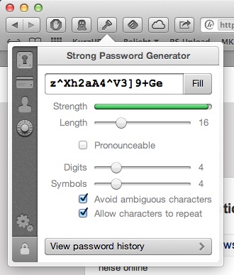 Gleiches Spiel, wenn ich mich irgendwo neu registriere und schnell ein neues Passwort benötige. Ein Klick auf das 1Password Symbol in der Toolbar und dann das Drehrad ermöglicht mir tolle Passworte generieren zu lassen.