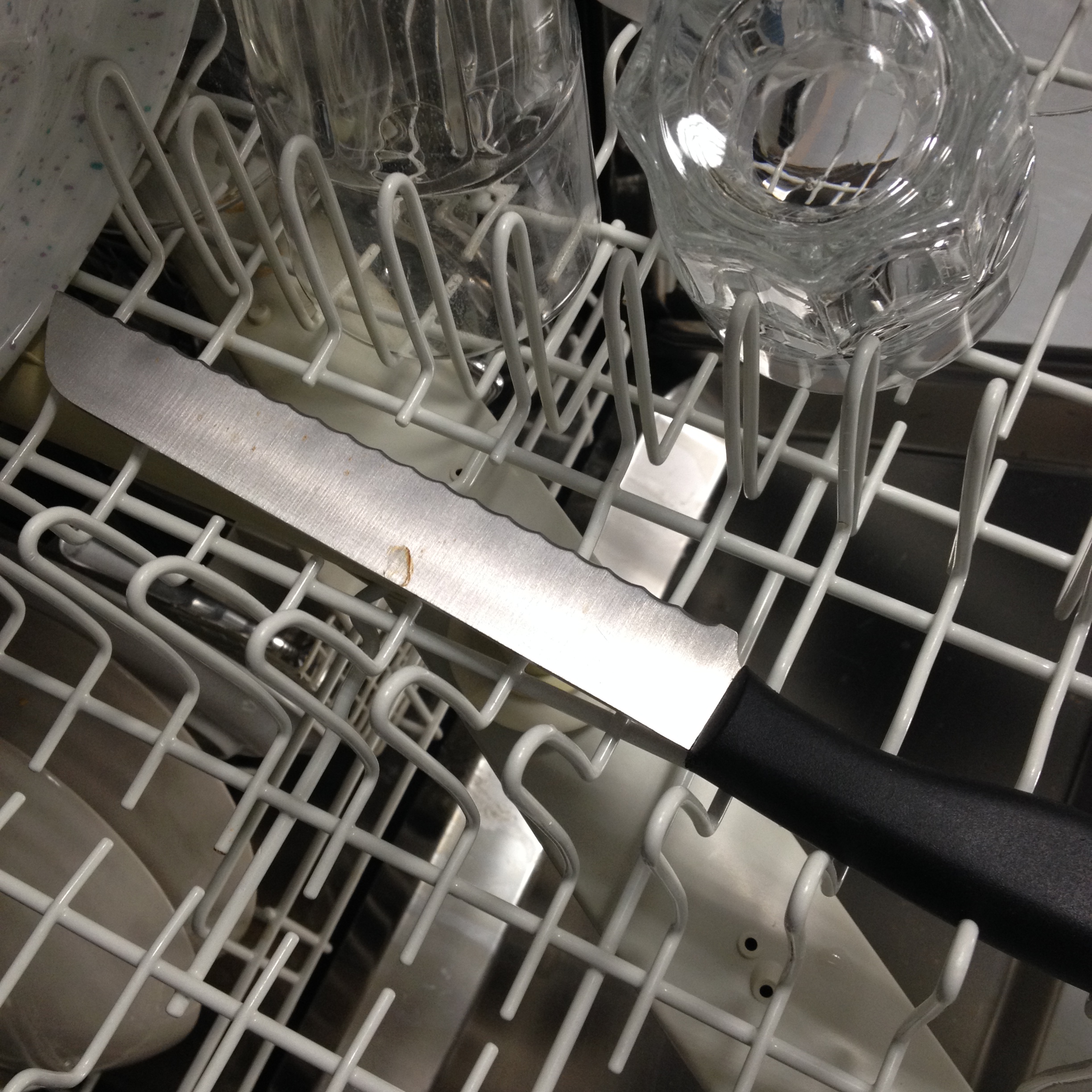 Ich räumte eben die Büro Spülmaschine aus… und da lag es wieder. Mein Brotmesser. Sauber gespült. Mit einem unschönen Add-on: *Rost! Genauer gesagt: Flugrost. Die Macht der Gewohnheit bringt alles in die Spülmaschine. Wenn man nicht drauf aufpasst unter anderem auch den schönen Alu-Moka-Espress der dann dank der Salze unschön oxidiert und ziemlich unansehnlich wird.